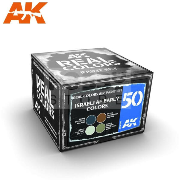 AK Interactive - REAL COLORS ISRAELI AF EARLY COLORS SET - festékszett RCS050 Tematikus festékszett 4 darab AK Real Color festékkel. Magas miőségű akril lakk bázisú festékszett modellezéshez-makettezéshez. Használatával a lehető legpontosabb színeket érhetjük el méretarányos modelljeinken. Rendkívül jól használható festékszóróval. Az AK -Interactive Real Color festékek