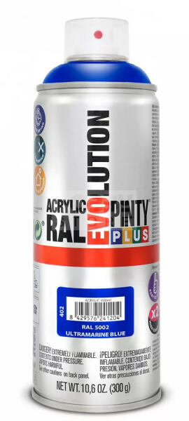 PINTYPLUS EVO AKRIL SPRAY RAL5002 - ULTRAMARINE KÉK (ULTRAMARINE) 400ML PP402 Az PintyPlus Evolution sorozat kiváló minőségű, magas pigmenttartalommal rendelkező, ultra gyorsan száradó, oldószeres akril festék spray család. A palettán 70 különböző szín, 3 lakk, 6 metál spray és 5 fluoreszkáló spray található. Univerzálisan használható, szinte bármilyen felületen. Magas