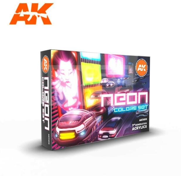 AK Interactive NEON COLORS SET festék szett AK11610 Tematikus festékszett 6 darab AK Interactive 3. generációs festékkel . Új formulával rendelkező magas fedőképességű festék mely kiválóan alkalmas festékszóróval és ecsettel való használatra egyaránt. Speciális összetevőinek köszönhetően nem tömődik el festékszórónk, és felrázás után azonnal használható ecset