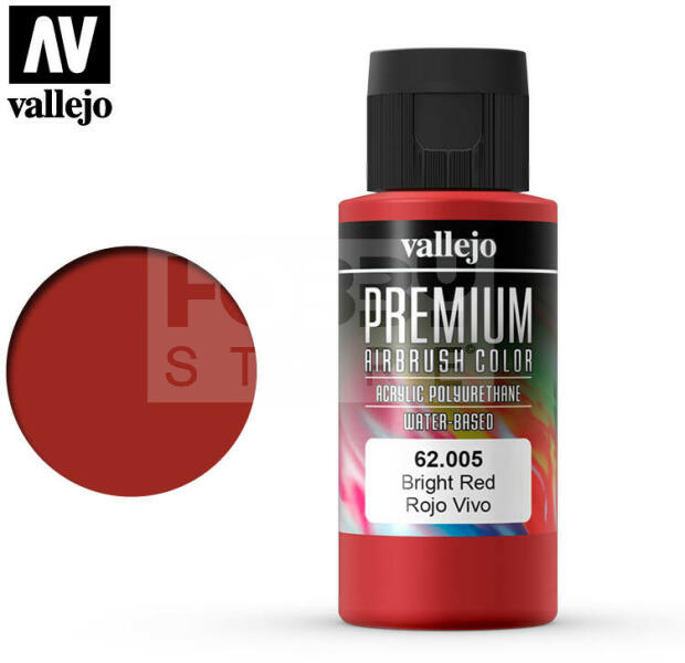 Vallejo Premium RC Colors Bright Red akrilfesték (60 ml) 62005V A Vallejo Premium RC sorozatot kifejezetten airbrush (szórópisztoly) használathoz lettek kifejlesztve. Tulajdonságának fő erőssége, hogy optimális tapadást biztosítsanak üvegszál, polietilén, polikarbonát, fém és lexan felületeken. A Premium RC sorozat speciális tartós pigmentekkel és egy új rendkívül ellenál