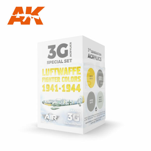 AK Interactive LUFTWAFFE FIGHTER COLORS 1941-1944 festék szett AK11720 Tematikus festékszett 4 darab AK Interactive 3. generációs festékkel . Új formulával rendelkező magas fedőképességű festék mely kiválóan alkalmas festékszóróval és ecsettel való használatra egyaránt. Speciális összetevőinek köszönhetően nem tömődik el festékszórónk, és felrázás után azonnal