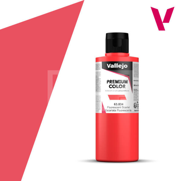 Vallejo Premium RC Colors Fluorescent Scarlet akrilffesték (200 ml) 63034V A Vallejo Premium RC sorozatot kifejezetten airbrush (szórópisztoly) használathoz lettek kifejlesztve. Tulajdonságának fő erőssége, hogy optimális tapadást biztosítsanak üvegszál, polietilén, polikarbonát, fém és lexan felületeken. A Premium RC sorozat speciális tartós pigmentekkel és egy új rendkív