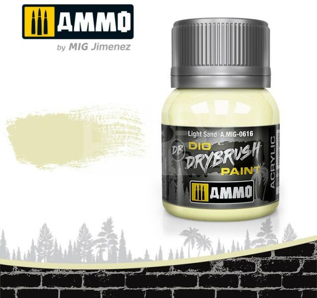 AMMO By Mig - DRYBRUSH Light Sand - szárazecsetelő festék 40ml - AMIG0616 Az AMMO Drybrush festékek egy új formulával készült termék mely kifejezetten a szárazecsetelős technikához lett kifejlesztve. Mindenkinek tökéletes megoldás aki szereti ezt a technikát. A DIO Drybrush sorozat világosabb színtónusokból áll hogy kopott megjelenést kölcsönözzön a maketteknek. Az AMMO D