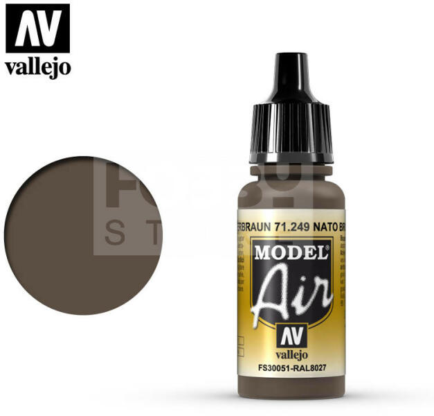Vallejo Model Air NATO Brown akrilfesték 71249V A Vallejo Model Air széria mattra száradó akrilfesték airbrush (szórópisztoly) használathoz lett kifejlesztve. A színválaszték a közelmúltban használt katonai színek legteljesebb választékát tartalmazza, beleértve az I. és a II. világháborút valamint a napjainkban használt színeket is. Mindegyik Model Air szín a meglévő é