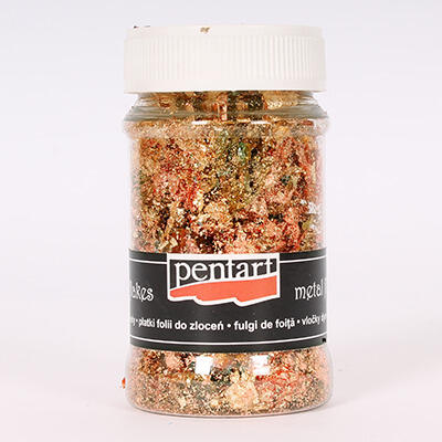 Márványosan foltos aranyozott felület készítésére alkalmazható füstfólia pelyhek izgalmas színvariációkban. A felületet oldószeres fényes lakkal védjük.