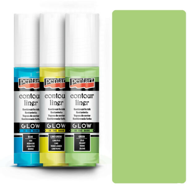 Pentart Kontúrozó festék sötétben világítóKiszerelés: 20 mlSzín: Zöldesfehér Pentart Kontúrozó festék sötétben világító 20 ml ZöldesfehérSötétben világító (foszforeszkáló), vízbázisú kontúrozó festék, mely alkalmazható minták körvonalainak körberajzolására, kiemelésére. Üvegfestéshez is használható, egyedi hatást lehet vele elérni.