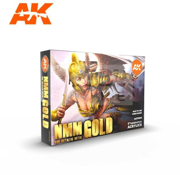 AK Interactive NMM (NON METALLIC METAL) GOLD festék szett AK11606 Tematikus festékszett 6 darab AK Interactive 3. generációs festékkel . Új formulával rendelkező magas fedőképességű festék mely kiválóan alkalmas festékszóróval és ecsettel való használatra egyaránt. Speciális összetevőinek köszönhetően nem tömődik el festékszórónk, és felrázás után azonnal haszn