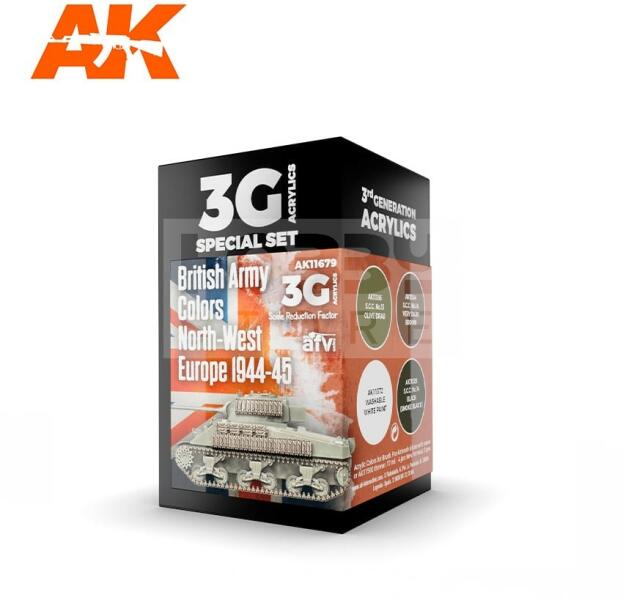 AK Interactive BRITISH ARMY COLORS NORTH-WEST EUROPE 1944-45 festékszett AK11679 Tematikus festékszett 4 darab AK Interactive 3. generációs festékkel . Új formulával rendelkező magas fedőképességű festék mely kiválóan alkalmas festékszóróval és ecsettel való használatra egyaránt. Speciális összetevőinek köszönhetően nem tömődik el festékszórónk, és felrázás utá