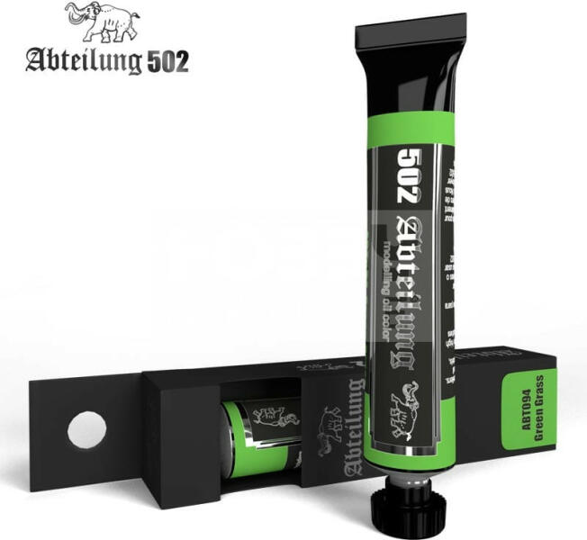 Abteilung502 - GREEN GRASS - Fűzöld színű olajfesték 20 ml - ABT094 Az Abteilung502 olajfesték család egy kiváló minőségű termék kifejezetten makettezőknek, és figura festőknek kifejlesztve. A termékekben kevesebb lenolaj található, így meggátolva, hogy a száradás után foltos maradjon a felület. Hihetetlen finom munkát tudunk végezni és nagyszerű hatásokat érhetünk