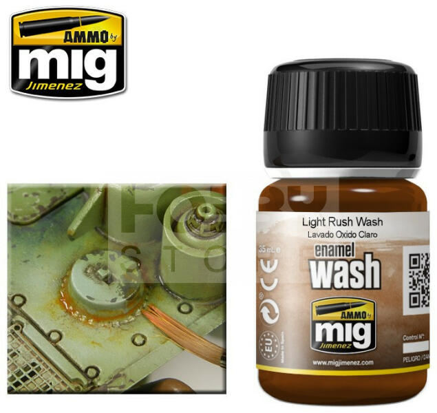 AMMO By Mig - LIGHT RUST WASH - világos rozsda színű bemosó folyadék makettezőknek 35ml - AMIG1004 Az AMMO Enamel alapú általános bemosó-átmosó effect folyadékok, melyek nagyon sokrétűen használhatóak. Alap technika a makettesek és wargamesek számára. Az AMMO By Mig effekt bemosók kiválóan alkalmasak a makettek, figurák koszolására élethű lerakodások (kosz, por, piszok
