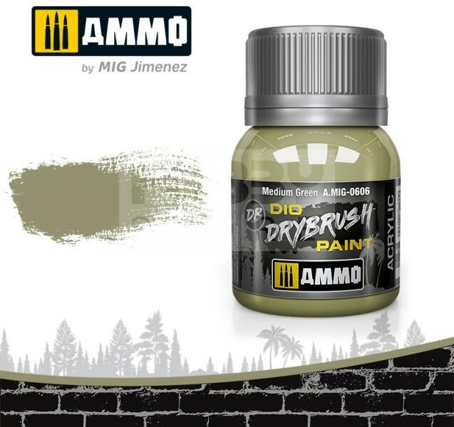 AMMO By Mig - DRYBRUSH Medium Green - szárazecsetelő festék 40ml - AMIG0606 Az AMMO Drybrush festékek egy új formulával készült termék mely kifejezetten a szárazecsetelős technikához lett kifejlesztve. Mindenkinek tökéletes megoldás aki szereti ezt a technikát. A DIO Drybrush sorozat világosabb színtónusokból áll hogy kopott megjelenést kölcsönözzön a maketteknek. Az AMMO
