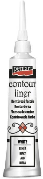 Pentart Kontúrozó festék fehér 20 ml 11036 Univerzális, vízbázisú, sűrű festék, mely bármely felületen alkalmazható minták körvonalainak körberajzolására, kiemelésére vagy 3D díszítések készítésére. Üvegfestéshez is kiváló! Száradás után vízálló és mosogatógépben mosható. Normál színek. Termék neveKontúrozó festék, normál - Contour liner, basicFelha