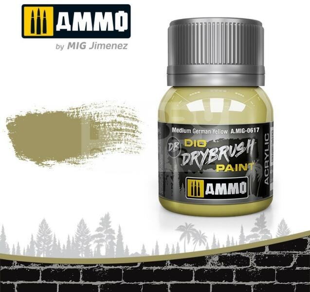 AMMO By Mig - DRYBRUSH Medium German Yellow - szárazecsetelő festék 40ml - AMIG0617 Az AMMO Drybrush festékek egy új formulával készült termék mely kifejezetten a szárazecsetelős technikához lett kifejlesztve. Mindenkinek tökéletes megoldás aki szereti ezt a technikát. A DIO Drybrush sorozat világosabb színtónusokból áll hogy kopott megjelenést kölcsönözzön a maketteknek.