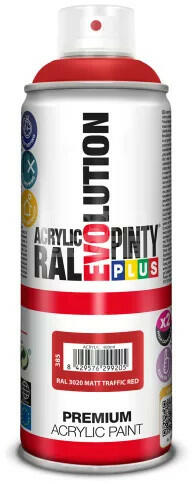 PINTYPLUS EVO AKRIL SPRAY RAL3020 - MATT JELZŐPIROS (MATT TRAFFIC RED) 400ML PP385 Az PintyPlus Evolution sorozat kiváló minőségű, magas pigmenttartalommal rendelkező, ultra gyorsan száradó, oldószeres akril festék spray család. A palettán 70 különböző szín, 3 lakk, 6 metál spray és 5 fluoreszkáló spray található. Univerzálisan használható, szinte bármilyen felületen.