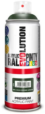 PINTYPLUS EVO AKRIL SPRAY RAL6020 - KRÓMZÖLD (CHROME GREEN) 400ML PP376 Az PintyPlus Evolution sorozat kiváló minőségű, magas pigmenttartalommal rendelkező, ultra gyorsan száradó, oldószeres akril festék spray család. A palettán 70 különböző szín, 3 lakk, 6 metál spray és 5 fluoreszkáló spray található. Univerzálisan használható, szinte bármilyen felületen. Magas pigm