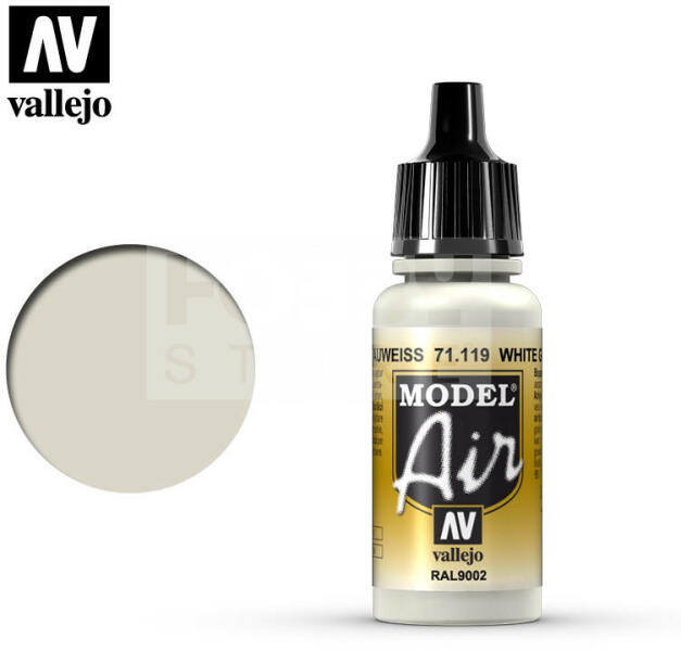 Vallejo Model Air White Gray akrilfesték 71119V A Vallejo Model Air széria mattra száradó akrilfesték airbrush (szórópisztoly) használathoz lett kifejlesztve. A színválaszték a közelmúltban használt katonai színek legteljesebb választékát tartalmazza, beleértve az I. és a II. világháborút valamint a napjainkban használt színeket is. Mindegyik Model Air szín a meglévő é