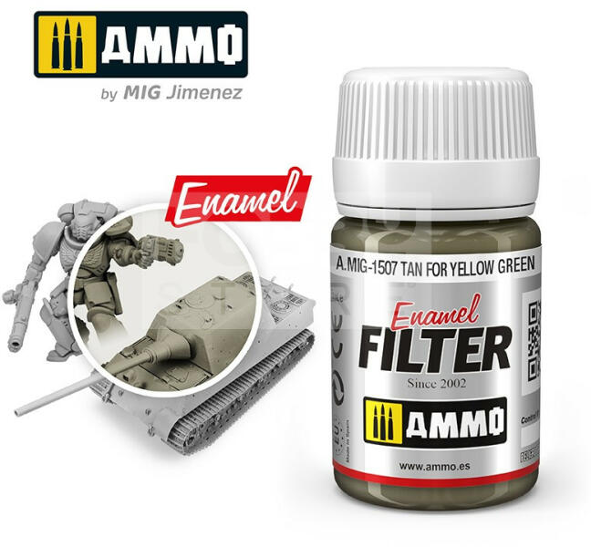 AMMO By Mig - TAN FOR YELLOW GREEN - Filterező folyadék makettezőknek 35ml - AMIG1507 Egyszerűen használható filterező folyadék makettezőknek. Az AMMO enamel alapú általános bemosó-átmosó, effect és filter folyadékok, melyek nagyon sokrétűen használhatóak. Alap technika a makettesek és wargamesek számára. Az AMMO By Mig effekt bemosók kiválóan alkalmasak a makettek, figu