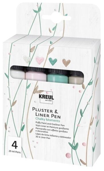 Felfúvódó toll készlet Chalky Moments KREUL / 4 darab A felfúvódó tollal Pic Tixx Pluster and LinerPen a világszerte ismert KREUL márkától az egész család jól elszórakozik majd. Ez a vízalapú hobby liner papír, fa, kerámia és textil díszítésére való. A 3D effektet modern színekben ezzel a termékkel elérhetjük sütés segítségével, vasalással vagy hajszárító seg