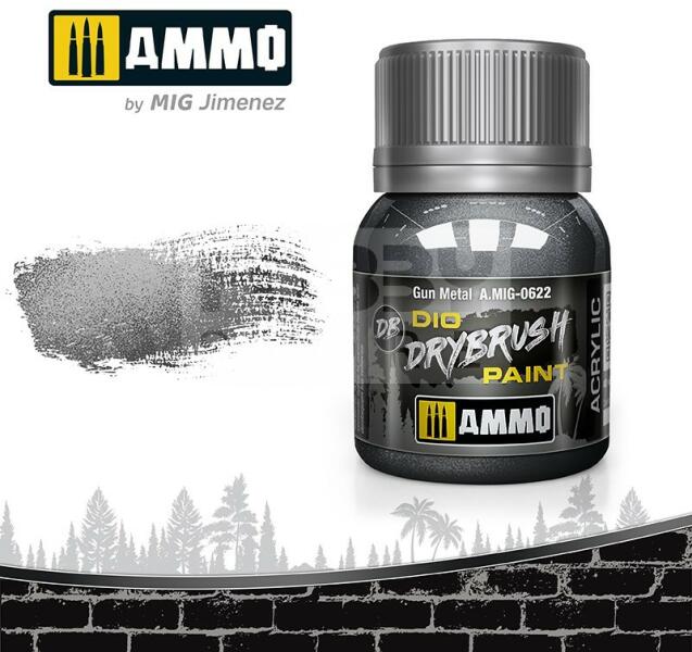 AMMO By Mig - DRYBRUSH Gun Metal - szárazecsetelő festék 40ml - AMIG0622 Az AMMO Drybrush festékek egy új formulával készült termék mely kifejezetten a szárazecsetelős technikához lett kifejlesztve. Mindenkinek tökéletes megoldás aki szereti ezt a technikát. A DIO Drybrush sorozat világosabb színtónusokból áll hogy kopott megjelenést kölcsönözzön a maketteknek. Az AMMO Dr