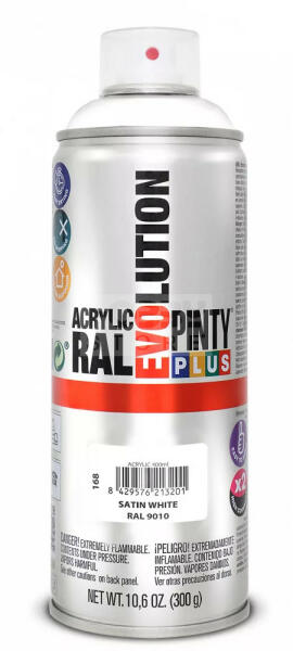 PINTYPLUS EVO AKRIL SPRAY RAL9010 - FÉLFÉNYES FEHÉR (SATIN PURE WHITE) 400ML PP168 Az PintyPlus Evolution sorozat kiváló minőségű, magas pigmenttartalommal rendelkező, ultra gyorsan száradó, oldószeres akril festék spray család. A palettán 70 különböző szín, 3 lakk, 6 metál spray és 5 fluoreszkáló spray található. Univerzálisan használható, szinte bármilyen felületen