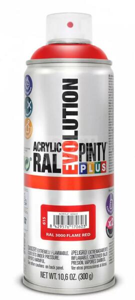 PINTYPLUS EVO AKRIL SPRAY RAL3000 - LÁNGVÖRÖS (FLAME RED) 400ML PP615 Az PintyPlus Evolution sorozat kiváló minőségű, magas pigmenttartalommal rendelkező, ultra gyorsan száradó, oldószeres akril festék spray család. A palettán 70 különböző szín, 3 lakk, 6 metál spray és 5 fluoreszkáló spray található. Univerzálisan használható, szinte bármilyen felületen. Magas pigme