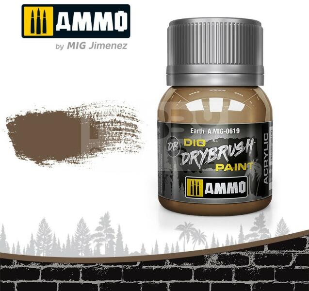 AMMO By Mig - DRYBRUSH Earth - szárazecsetelő festék 40ml - AMIG0619 Az AMMO Drybrush festékek egy új formulával készült termék mely kifejezetten a szárazecsetelős technikához lett kifejlesztve. Mindenkinek tökéletes megoldás aki szereti ezt a technikát. A DIO Drybrush sorozat világosabb színtónusokból áll hogy kopott megjelenést kölcsönözzön a maketteknek. Az AMMO Drybru