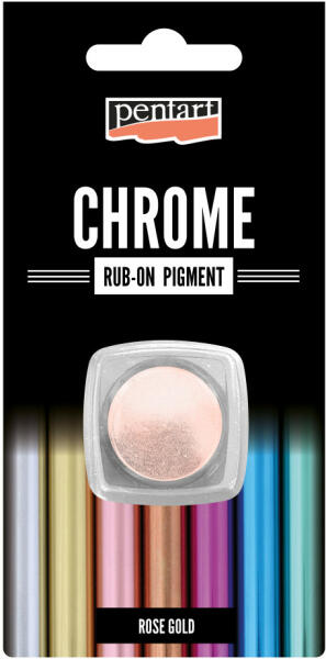 Rub-on pigment króm effectKiszerelés: 0,5 gSzín: rózsaarany Rub-on pigment króm effectKiszerelés: 0,5 gSzín: rózsaaranySpeciális pigment, mellyel gyönyörű, fényes króm hatású felületet készíthetünk. A legszebb hatást nagyon sima, egyenletes felületen érhetjük el. Erősebb igénybevétel esetén lakkozás szükséges. Használata: Teljesen sima felületre vigyük fel az ujjb