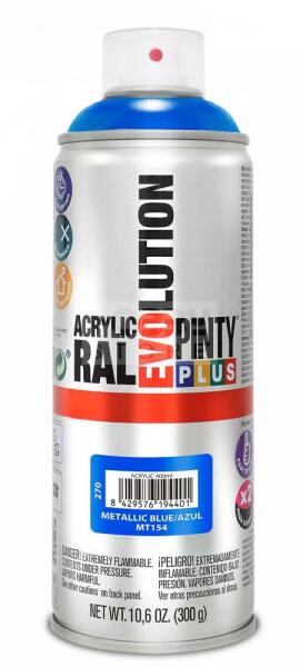PINTYPLUS EVO AKRIL METAL SPRAY BLUE MT154 - METÁL KÉK SPRAY 400ML PP270 Biciklik, gördeszkák, sárvédők, sisakok stb. felújjítására karbantartására, dekorálására használható. Kül- és beltérre egyaránt alkalmas, szinte minden felületre (fa, fém, karton, papír, üveg és a műanyagok többsége). Az PintyPlus Evolution sorozat kiváló minőségű, magas pigmenttartalommal r