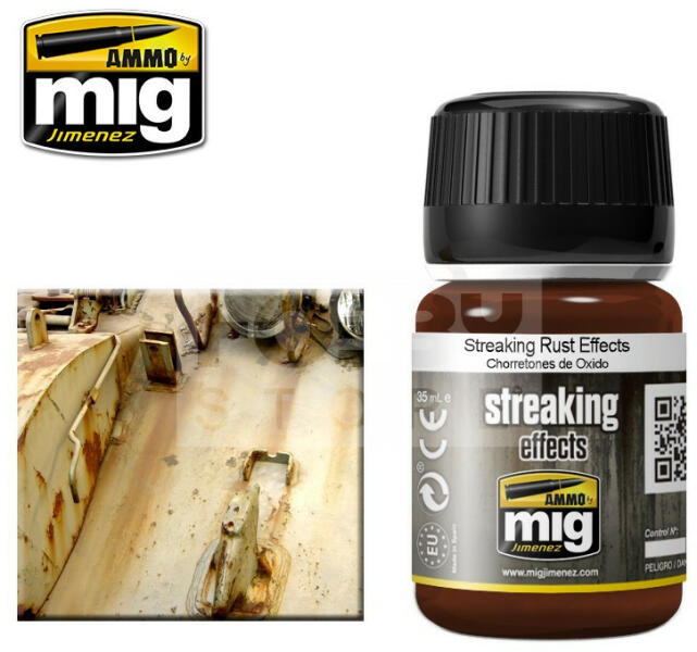 AMMO By Mig - STREAKING RUST EFFECTS - koszoló folyadék makettezőknek 35ml - AMIG1204 Az AMMO By Mig Streaking Grimes effektekkel könnyedén hozhatunk létre különböző anyagok által okozott megfolyásokat, kosz csíkokat a makettek felületein . Az AMMO Enamel alapú általános bemosó-átmosó effect folyadékok, melyek nagyon sokrétűen használhatóak. Alap technika a makettesek és