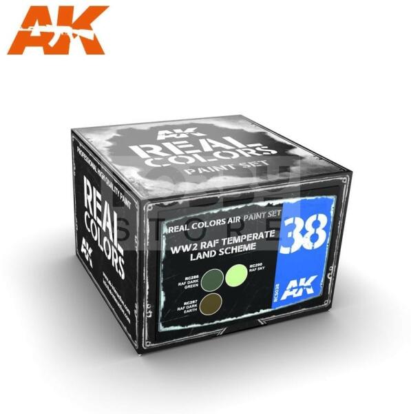 AK Interactive - REAL COLORS RAF TEMPERATE LAND SCHEME - festékszett RCS038 Tematikus festékszett 3 darab AK Real Color festékkel. Magas miőségű akril lakk bázisú festékszett modellezéshez-makettezéshez. Használatával a lehető legpontosabb színeket érhetjük el méretarányos modelljeinken. Rendkívül jól használható festékszóróval. Az AK -Interactive Real Color festékek ki