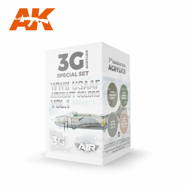 AK Interactive WWII USAAF AIRCRAFT COLORS VOL. 1 festék szett AK11732 Tematikus festékszett 4 darab AK Interactive 3. generációs festékkel . Új formulával rendelkező magas fedőképességű festék mely kiválóan alkalmas festékszóróval és ecsettel való használatra egyaránt. Speciális összetevőinek köszönhetően nem tömődik el festékszórónk, és felrázás után azonnal h