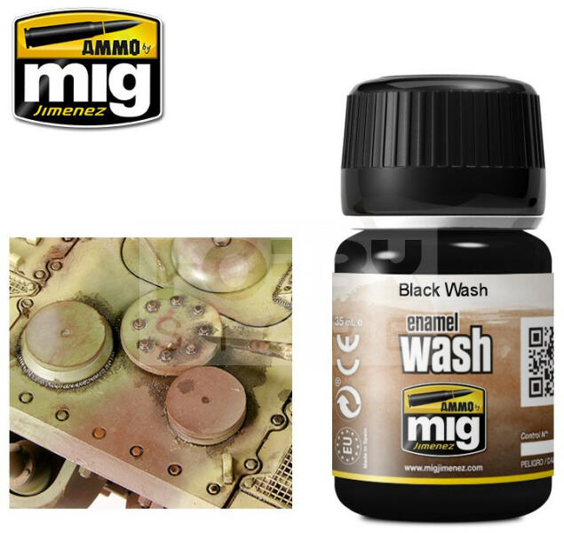 AMMO By Mig - Black Wash - fekete színű bemosó folyadék makettezőknek 35ml - AMIG1011 Az AMMO Enamel alapú általános bemosó-átmosó effect folyadékok, melyek nagyon sokrétűen használhatóak. Alap technika a makettesek és wargamesek számára. Az AMMO By Mig effekt bemosók kiválóan alkalmasak a makettek, figurák koszolására élethű lerakodások (kosz, por, piszok, rozsda) lét