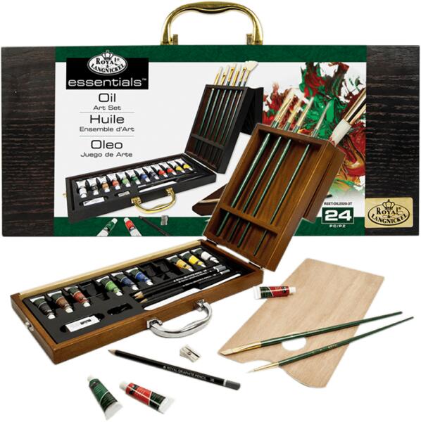 Egy olaj színek egy fadobozban Royal Langnickel - készlet 24 db A csomag tartalma: 12 x 12 ml olajfesték tubusban 6 db fehér Taklon ecset 1 db grafitceruza 1 db paletta 1 db műanyag spatula 1 db fehér radír 1 db hegyező 1 db fa doboz