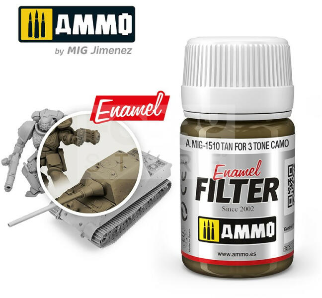 AMMO By Mig - TAN FOR 3 TONE CAMO - Filterező folyadék makettezőknek 35ml - AMIG1510 Egyszerűen használható filterező folyadék makettezőknek. Az AMMO enamel alapú általános bemosó-átmosó, effect és filter folyadékok, melyek nagyon sokrétűen használhatóak. Alap technika a makettesek és wargamesek számára. Az AMMO By Mig effekt bemosók kiválóan alkalmasak a makettek, figur