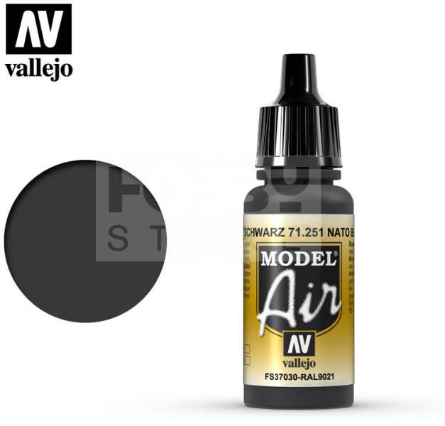 Vallejo Model Air NATO Black akrilfesték 71251V A Vallejo Model Air széria mattra száradó akrilfesték airbrush (szórópisztoly) használathoz lett kifejlesztve. A színválaszték a közelmúltban használt katonai színek legteljesebb választékát tartalmazza, beleértve az I. és a II. világháborút valamint a napjainkban használt színeket is. Mindegyik Model Air szín a meglévő é