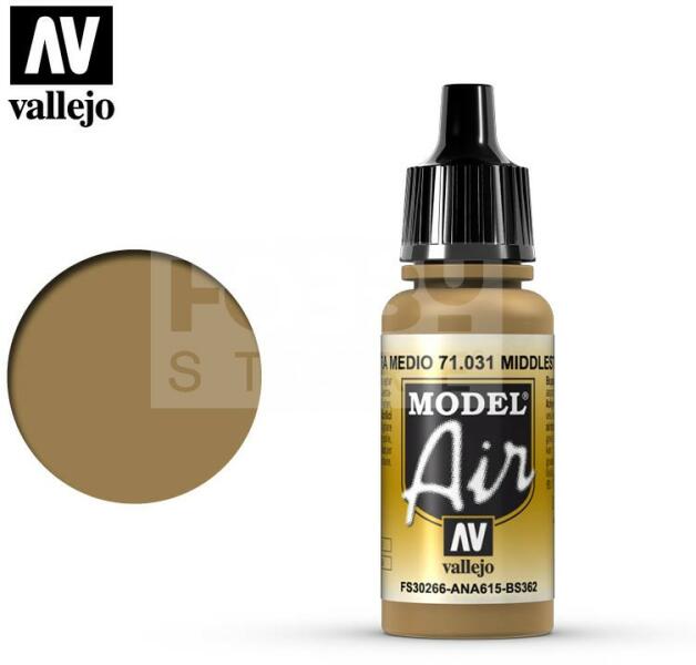 Vallejo Model Air Middlestone akrilfesték 71031V A Vallejo Model Air széria mattra száradó akrilfesték airbrush (szórópisztoly) használathoz lett kifejlesztve. A színválaszték a közelmúltban használt katonai színek legteljesebb választékát tartalmazza, beleértve az I. és a II. világháborút valamint a napjainkban használt színeket is. Mindegyik Model Air szín a meglévő