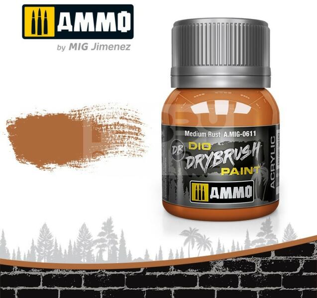 AMMO By Mig - DRYBRUSH Medium Rust - szárazecsetelő festék 40ml - AMIG0611 Az AMMO Drybrush festékek egy új formulával készült termék mely kifejezetten a szárazecsetelős technikához lett kifejlesztve. Mindenkinek tökéletes megoldás aki szereti ezt a technikát. A DIO Drybrush sorozat világosabb színtónusokból áll hogy kopott megjelenést kölcsönözzön a maketteknek. Az AMMO