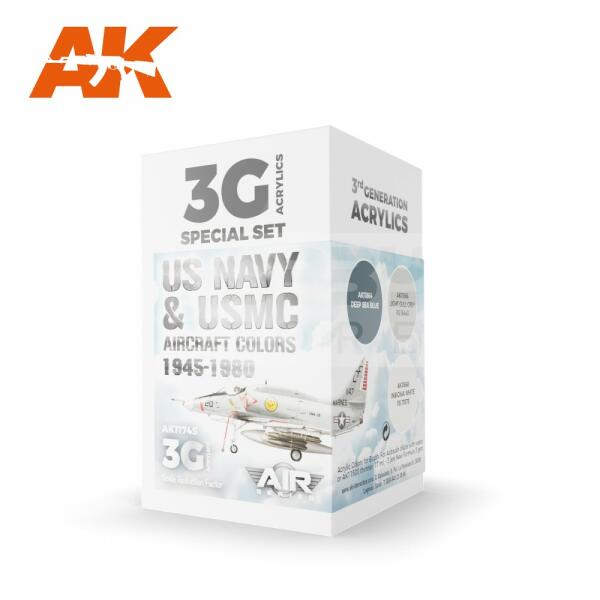 AK Interactive US Navy & USMC Aircraft Colors 1945-1980 festék szett AK11745 Tematikus festékszett 3 darab AK Interactive 3. generációs festékkel . Új formulával rendelkező magas fedőképességű festék mely kiválóan alkalmas festékszóróval és ecsettel való használatra egyaránt. Speciális összetevőinek köszönhetően nem tömődik el festékszórónk, és felrázás utá
