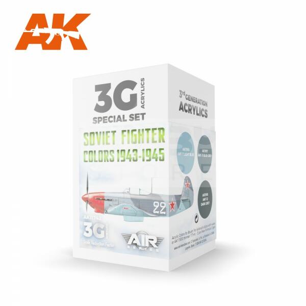 AK Interactive Soviet Fighter Colors 1943-1945 festék szett AK11742 Tematikus festékszett 3 darab AK Interactive 3. generációs festékkel . Új formulával rendelkező magas fedőképességű festék mely kiválóan alkalmas festékszóróval és ecsettel való használatra egyaránt. Speciális összetevőinek köszönhetően nem tömődik el festékszórónk, és felrázás után azonnal has