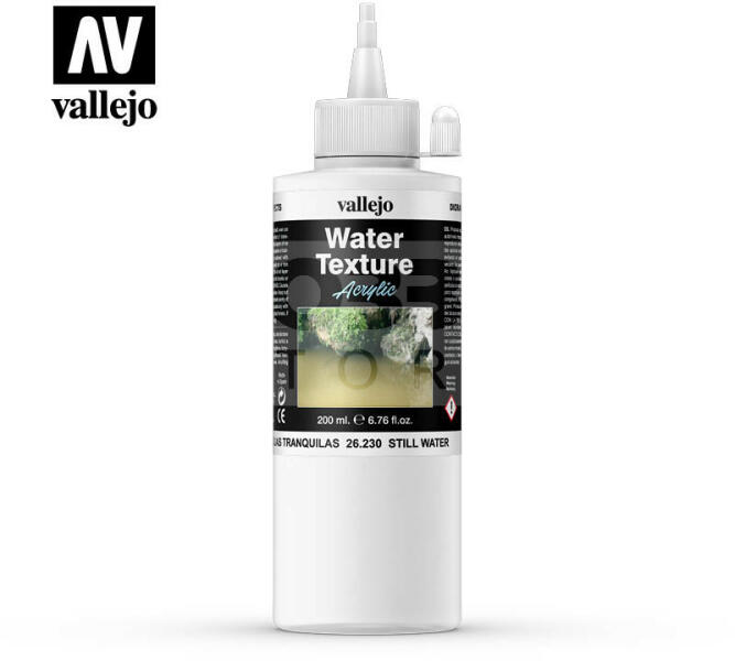 Vallejo Still Water 200 ml 26230 Vízbázisú poliuretán folyadék amit egyenesen az flakonból a kívánt helyre önthetünk. 1-2mm-es rétegekben érdemes felvinni. Felvitel után a a rétegek maguktól terülnek és 24 óra alatt teljesen kristálytiszta kemény réteggé száradnak. Ha nem porózus felületre öntjük ki hanem fényes műanyag felületre akkor a száradás után a réteg lev