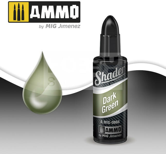 AMMO By Mig - DARK GREEN SHADER - Akril árnyékoló - koszoló folyadék makettezőknek 10ml - AMIG0866 Az Ammo Shaders egy teljesen új típusú termék makettezőknek. Különböző effektek létrehozására szolgál maketteken. Az átlátszó és ultrafinom festék lehetővé teszi kezdő és haladó makettezőknek egyaránt, hogy lenyűgözően élethű hatásokat érjen el amik korábban leh