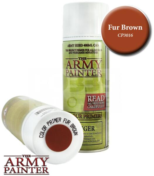 The Army Painter Colour Primer - Fur Brown alapozó Spray CP3016 Az Army Painter Color Primer spray-k nagyszerő fedőképességű formulával rendelkeznek. Kiválóan alkalmasak műanyag, fém és gyanta figurák makettek alapozásához. Extra finom pigmentet tartalmaznak és a speciális fúvókának köszönhetően rendkívül könnyen fújhatók fel a kívánt felületre. Az Army Painter alapo