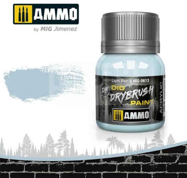 AMMO By Mig - DRYBRUSH Light Blue - szárazecsetelő festék 40ml - AMIG0613 Az AMMO Drybrush festékek egy új formulával készült termék mely kifejezetten a szárazecsetelős technikához lett kifejlesztve. Mindenkinek tökéletes megoldás aki szereti ezt a technikát. A DIO Drybrush sorozat világosabb színtónusokból áll hogy kopott megjelenést kölcsönözzön a maketteknek. Az AMMO D