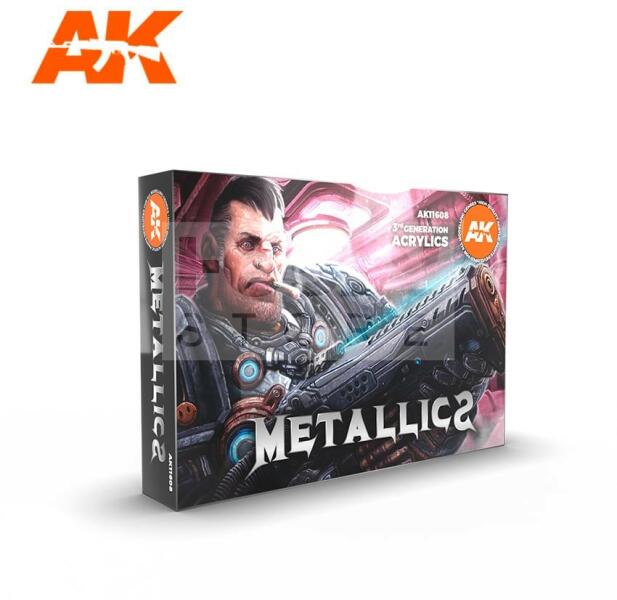 AK Interactive METALLICS COLORS SET festék szett AK11608 Tematikus festékszett 6 darab AK Interactive 3. generációs festékkel . Új formulával rendelkező magas fedőképességű festék mely kiválóan alkalmas festékszóróval és ecsettel való használatra egyaránt. Speciális összetevőinek köszönhetően nem tömődik el festékszórónk, és felrázás után azonnal használható