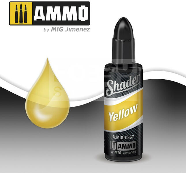 AMMO By Mig - YELLOW SHADER - Akril árnyékoló - koszoló folyadék makettezőknek 10ml - AMIG0867 Az Ammo Shaders egy teljesen új típusú termék makettezőknek. Különböző effektek létrehozására szolgál maketteken. Az átlátszó és ultrafinom festék lehetővé teszi kezdő és haladó makettezőknek egyaránt, hogy lenyűgözően élethű hatásokat érjen el amik korábban lehetet
