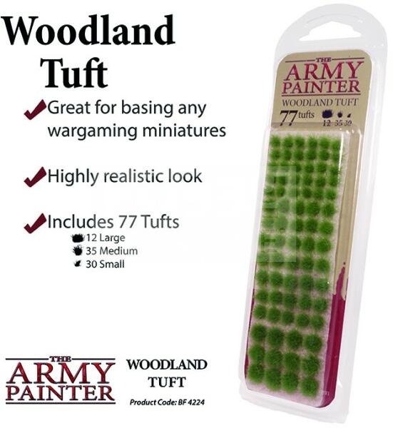 The Army Painter Realisztikus WOODLAND TUFT- erdei fűcsomók diorámához 77 darab BF4224 Innovatív, öntapadós műfű (Self-Adhesive Grass Tuft) bokrok. Ideális figurák talpainak, diorámák részleteinek (erdők, utak széleinek vizpartok díszítésére, realisztikussá tételére. Bár öntapadós, bizonyos felületeken ragasztót kell használni a végső rögzítéshez, melyhez kiváló