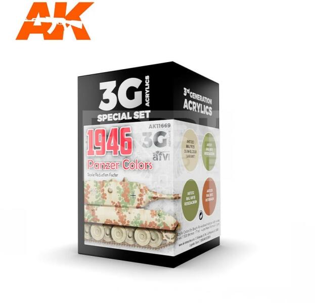 AK Interactive 1946 PANZER COLORS festékszett AK11669 Tematikus festékszett 4 darab AK Interactive 3. generációs festékkel . Új formulával rendelkező magas fedőképességű festék mely kiválóan alkalmas festékszóróval és ecsettel való használatra egyaránt. Speciális összetevőinek köszönhetően nem tömődik el festékszórónk, és felrázás után azonnal használható ecs