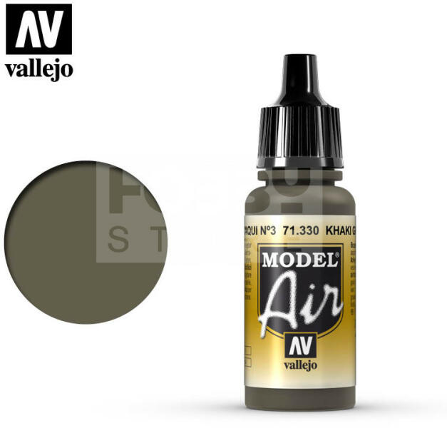 Vallejo Model Air Khaki Green Num. 3 akrilfesték 71330V A Vallejo Model Air széria mattra száradó akrilfesték airbrush (szórópisztoly) használathoz lett kifejlesztve. A színválaszték a közelmúltban használt katonai színek legteljesebb választékát tartalmazza, beleértve az I. és a II. világháborút valamint a napjainkban használt színeket is. Mindegyik Model Air szín a megl