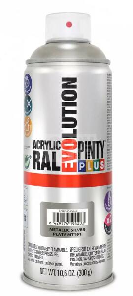 PINTYPLUS EVO AKRIL METAL SPRAY SPRAY MT191 - METÁL EZÜST 400ML PP269 Biciklik, gördeszkák, sárvédők, sisakok stb. felújjítására karbantartására, dekorálására használható. Kül- és beltérre egyaránt alkalmas, szinte minden felületre (fa, fém, karton, papír, üveg és a műanyagok többsége). Az PintyPlus Evolution sorozat kiváló minőségű, magas pigmenttartalommal rend
