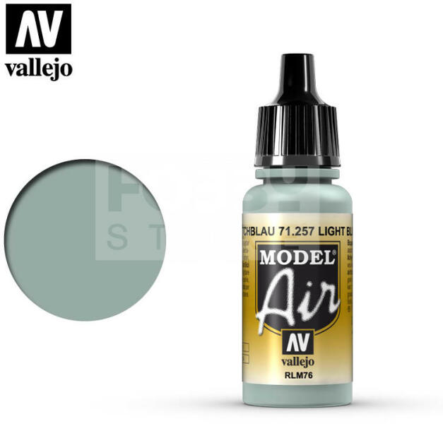 Vallejo Model Air Light Blue RLM76 akrilfesték 71257V A Vallejo Model Air széria mattra száradó akrilfesték airbrush (szórópisztoly) használathoz lett kifejlesztve. A színválaszték a közelmúltban használt katonai színek legteljesebb választékát tartalmazza, beleértve az I. és a II. világháborút valamint a napjainkban használt színeket is. Mindegyik Model Air szín a meglé